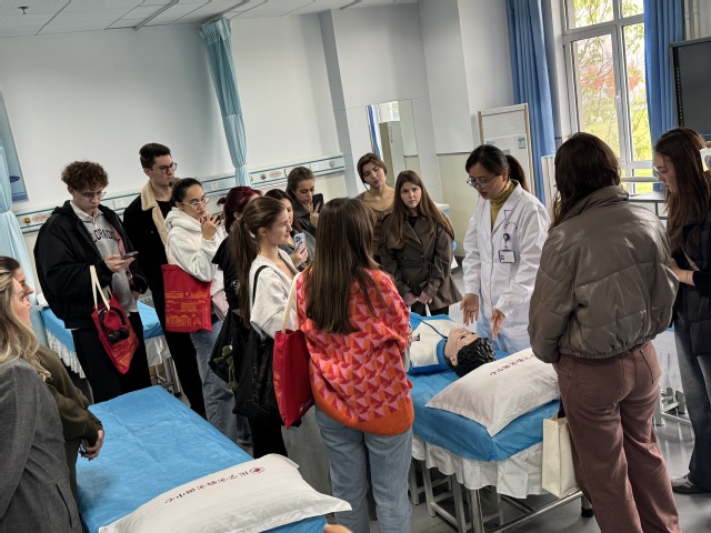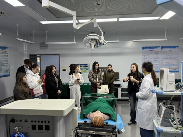 仪式结束后,来自巴西与俄罗斯两所高校临床医学专业的14名师生走进我校临床能力培训中心,开启了沉浸式临床见实习之旅。中心工作人员段畅向代表团详细介绍了实验实训平台的硬件建设、功能布局以及先进的可视化教学系统在实际教学中的应用情况,并引导师生参观了各专项技能训练区。