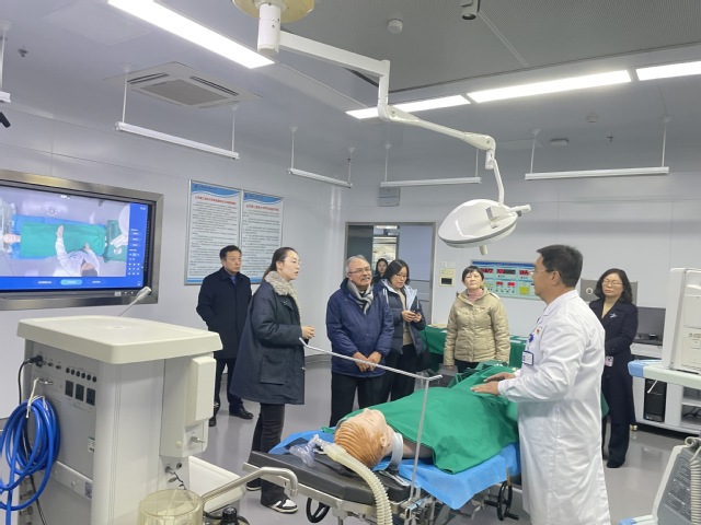 代表团先后走访可视化教学系统展示区,以及临床技能学、麻醉学、护理学、内科学实验室,实地查看各实验室标准化配置与先进教学仪器,了解实践教学开展情况。随后参观了模拟 ICU 病房与手术室,直观感受高度仿真的临床实训环境与技能培训流程。